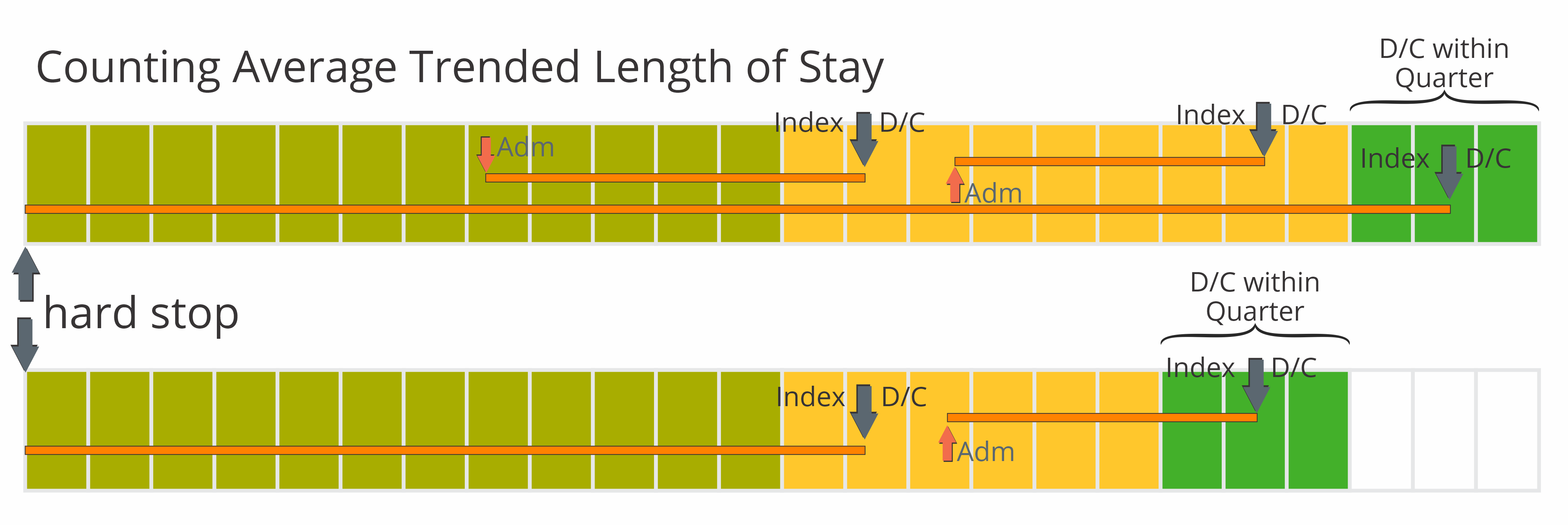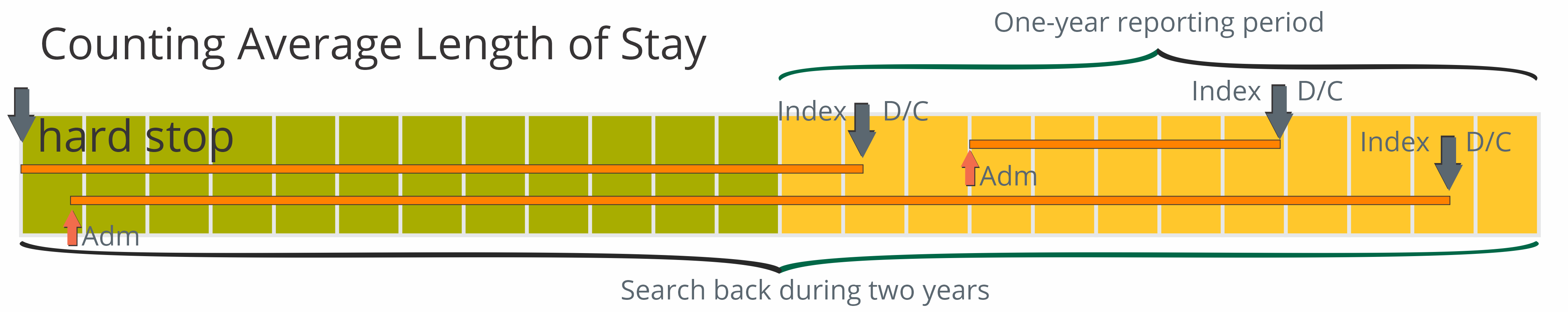 To calculate an average length of stay, we start by looking for a facility discharge. This index event must be on a claim submitted during the most recent one year reporting period, or, in the case of trended metrics, in the quarter for which the count is to be calculated. From that date we look back for an admission or to the start of the reference period. The reference period for counting the number of days in a stay is within two years prior of the end of the most recent quarter of data. See the image for details.